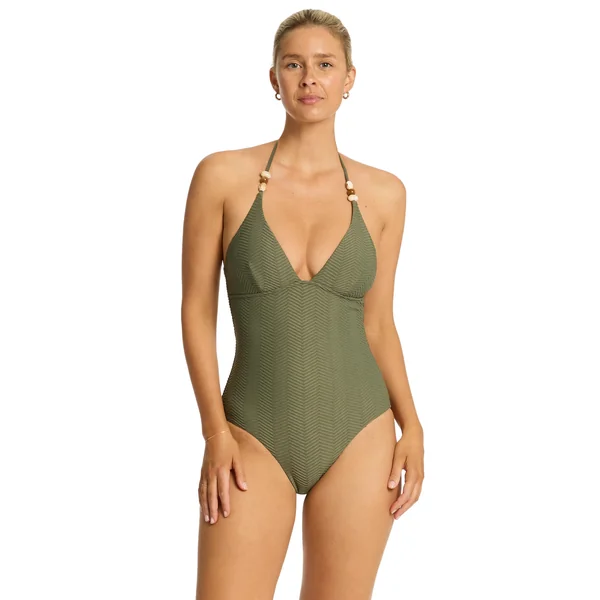 Textured one piece swimsuit features plunging neckline, and bead detailing on the straps. Offers removable soft cups, adjustable halter ties, and moderate bottom coverage.