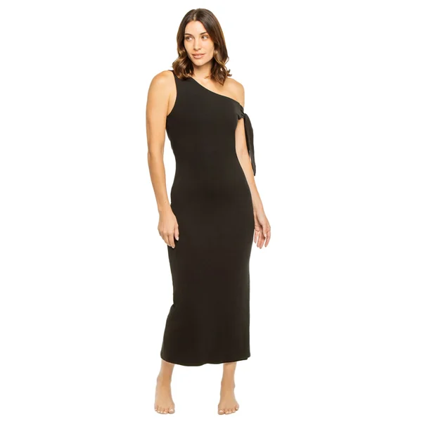 Carlota midi dress features asymmetrical top with an off the shoulder tie.