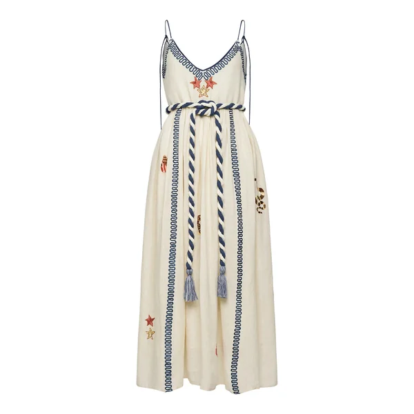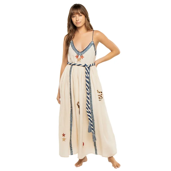 Carmen tropical theme maxi dress features a contrast striped removable rope belt and offers adjustable straps