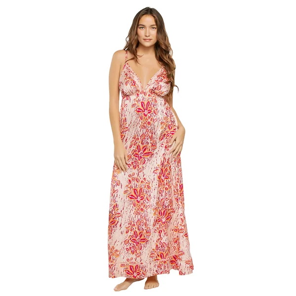 Cassandra maxi dress features floral damask print, a v-neckline, cinched empire waist and adjustable spaghetti straps.