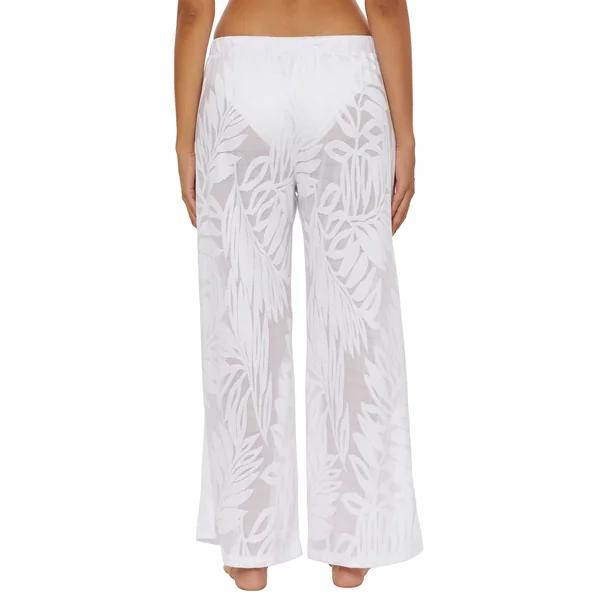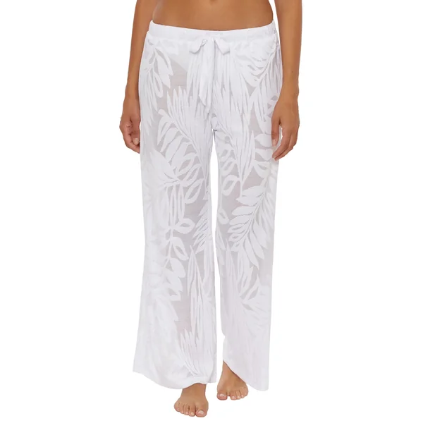 Pants feature sheer fabric with tropical palm print and offer a drawstring waistband.