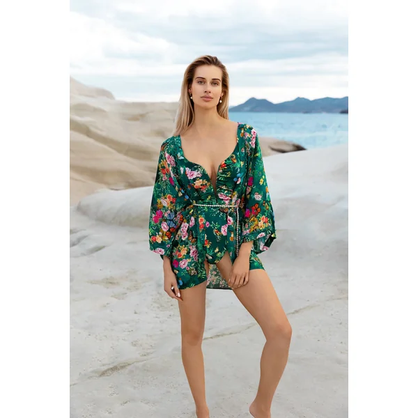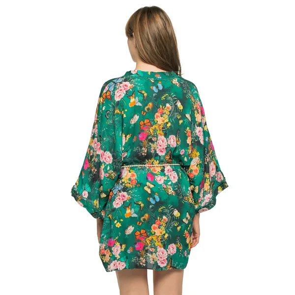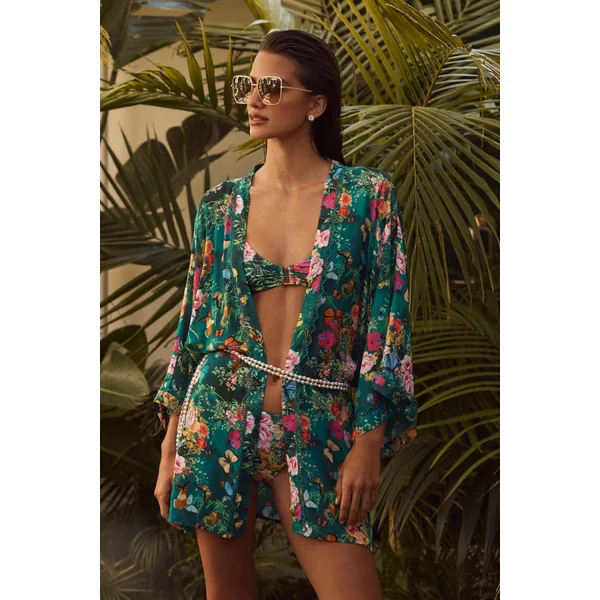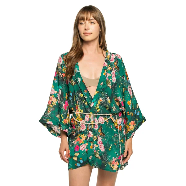 Kimono features floral butterfly print, picot trim, long sleeves, and a faux pearl and pave belt.