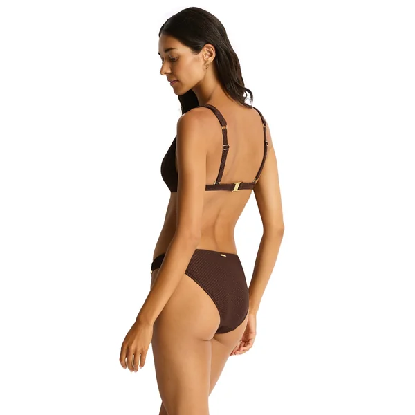 Bikini top features textured shimmer fabric, a chain link detail at center front, adjustable convertible straps, and power mesh support. Offers removable cups and a butterfly back clip.