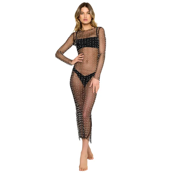 Champagne Nights mesh dress features faux pearl and crystal embellishment.