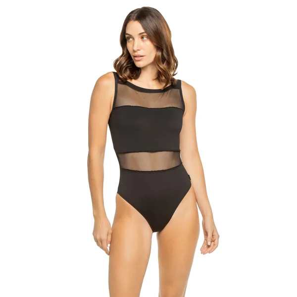 Charlie one piece features a mesh insets, fixed over the shoulder straps, and cheeky bottom coverage.