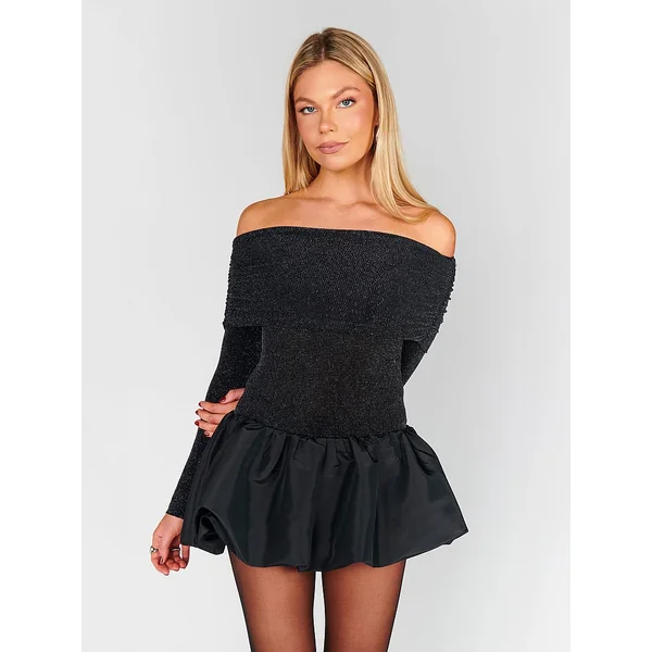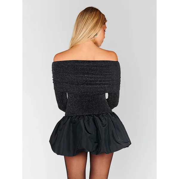 This chic, party-ready style stuns thanks to a shimmery bodice and roll-down, off-the-shoulder silhouette. A playful bubble Skirt adds a sweet finish.