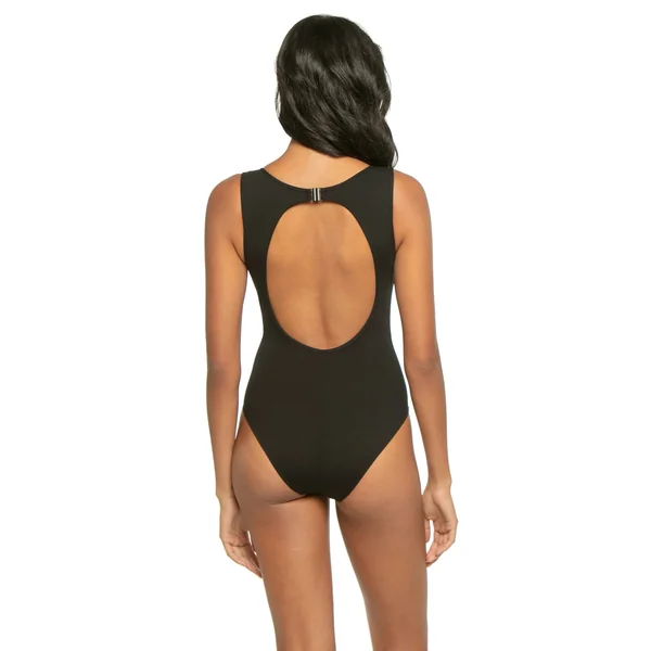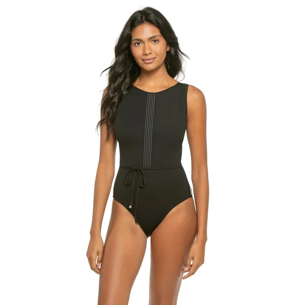 One piece swimsuit features a high neckline, vertical stitch detailing down center and decorative tie at waist. Offers an open back and clasp closure.