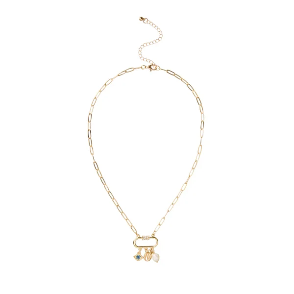 Necklace features a paperclip chain, metal pendant with fresh water pearl detail, shell charm and rhinestone charm. Offers a lobster clasp closure.