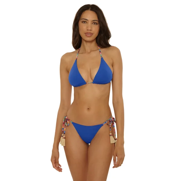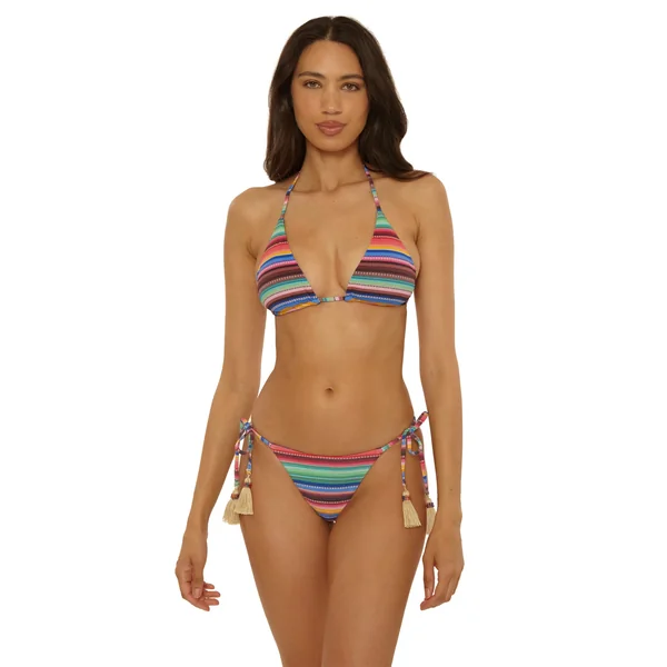 Textured bikini top features a striped print that reverses to a solid and offers removable soft cups, adjustable halter ties with tassels, and adjustable back tie adorned with tassels.