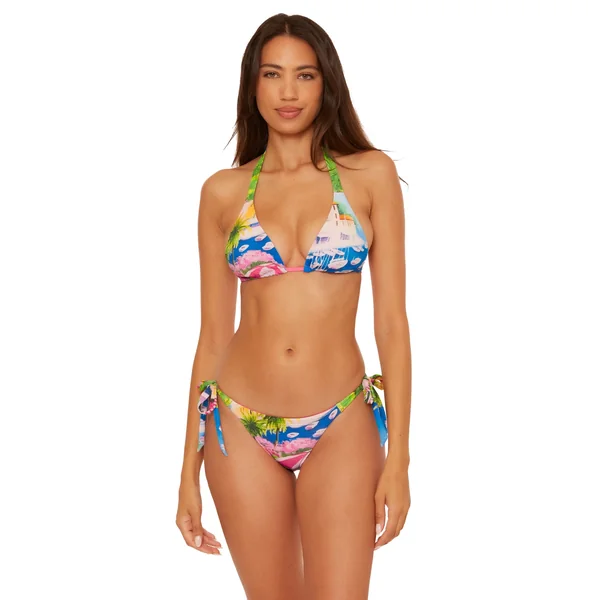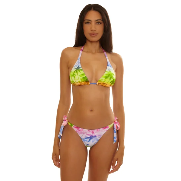 Bikini top features watercolor stylized tropical print that reverses to a solid and offers removable soft cups, adjustable halter ties, and a tie back closure.
