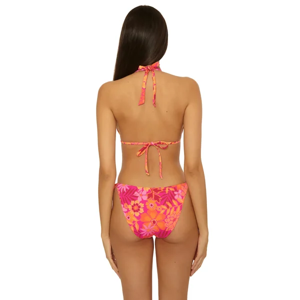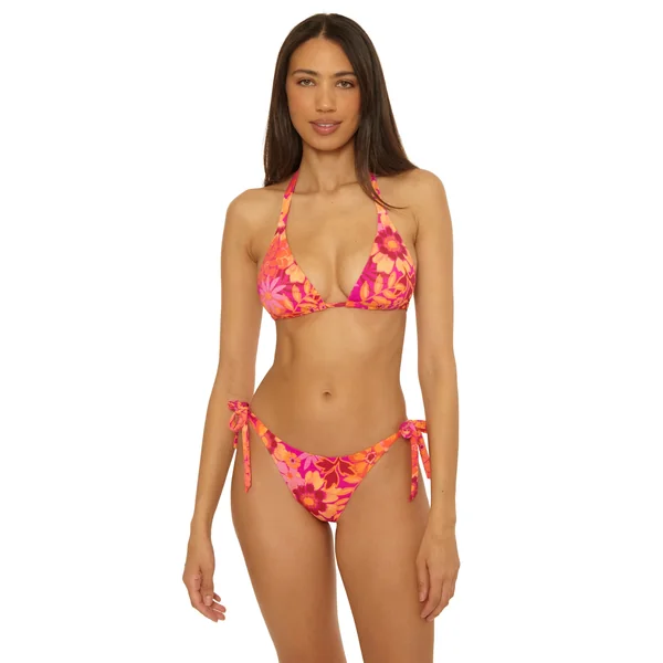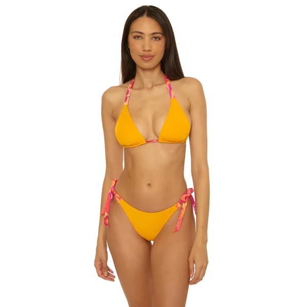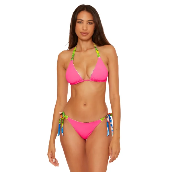Cheryl textured triangle bikini top features floral print that reverses to a solid, removable soft cups, and adjustable ties at neck and back.