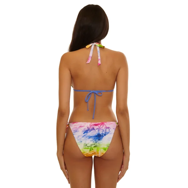 Reversible bikini top features seersucker textured fabric with Italian vacation scene. Offers soft cups, adjustable halter ties, and a tie back closure.