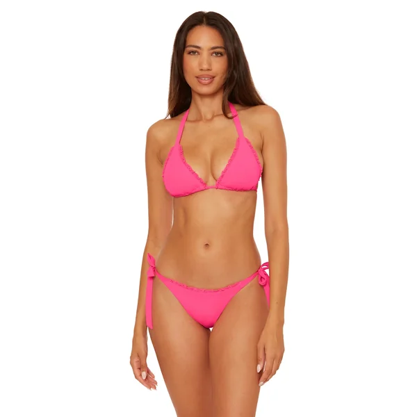 Cheryl triangle bikini top features plisse textured shimmer fabric, removable soft cups and adjustable ties at neck and back.