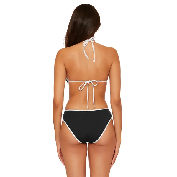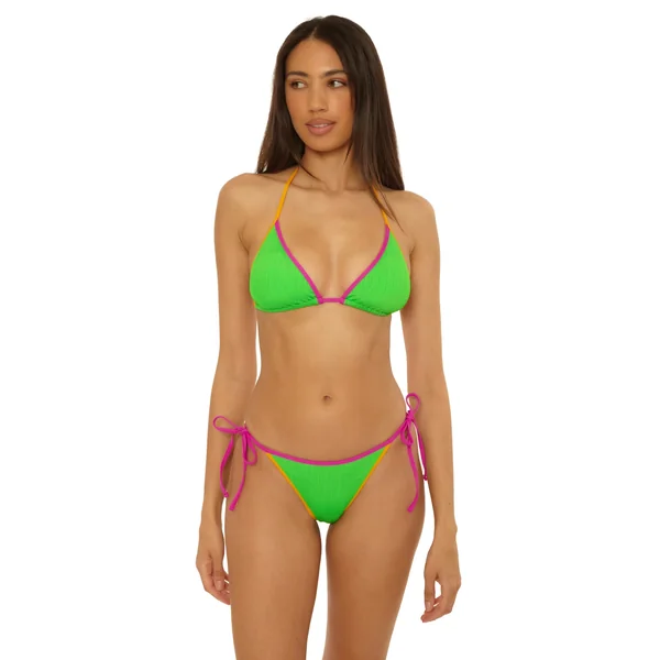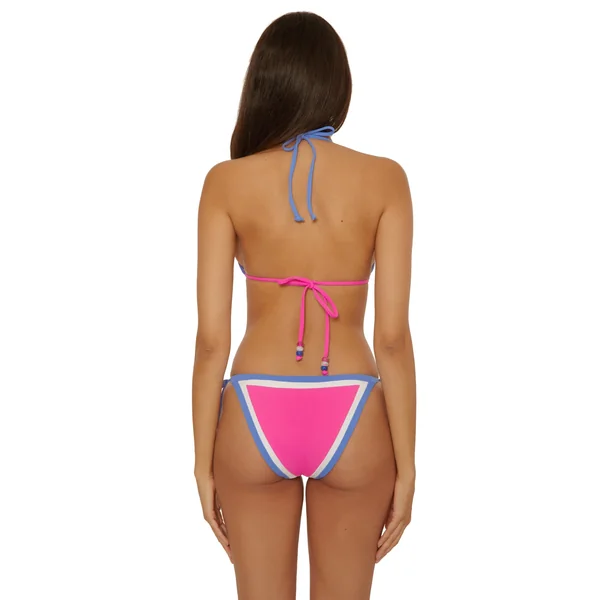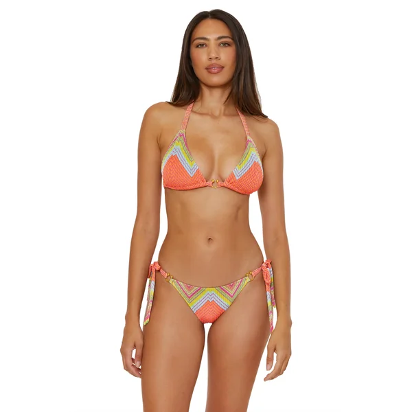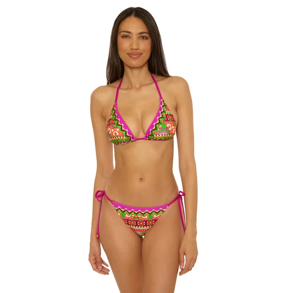Bikini top features textured fabric, color block detailing, and multi-color acrylic bead accents. Offers removable soft cups and adjustable neck and back ties.