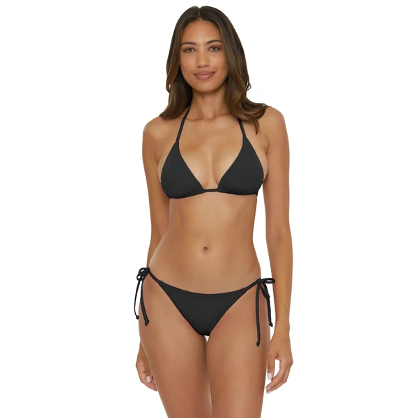 Cheryl triangle bikini top features fine ribbed texture and a gold mini horseshoe center detail. Offers removable halter cups and adjustable ties at neck and back.