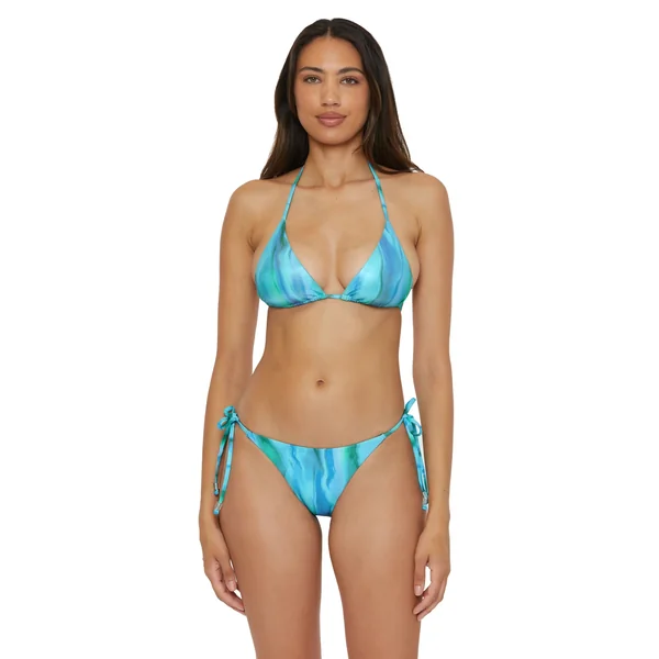 Cheryl triangle bikini top features gold foil dusting on a tie-dye wash design. Offers removable soft cups and adjustable ties at neck and back.