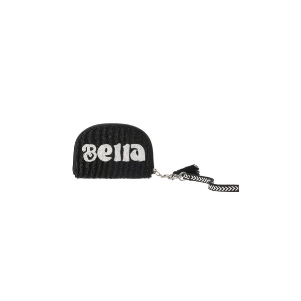Wallet features beaded detailing, detachable wristlet strap with tassel, zipper closure, and interior card organizer.