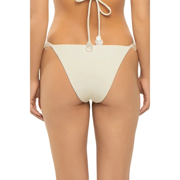 Cici bikini bottom features hand-sewn iridescent shell tab sides and offers cheeky coverage.
