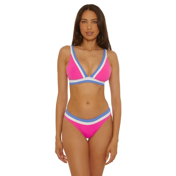 Bikini top features textured fabric, color block detailing, and multi-color acrylic bead accents. Offers removable soft cups and an adjustable tie back.
