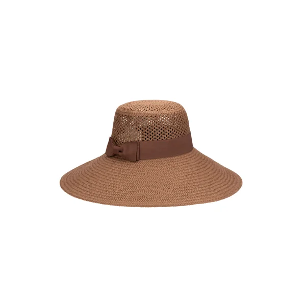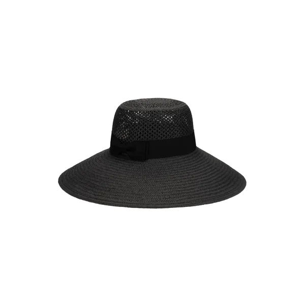 Hat features woven paper straw and a wide band with bow.