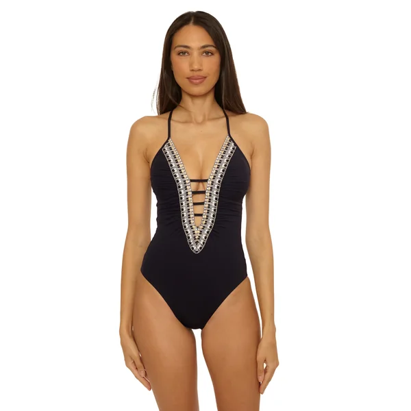 Clare one piece features a plunging neckline with multicolored basket weave trim and ladder straps. Offers removable soft cups, adjustable x-back straps, and moderate bottom coverage.