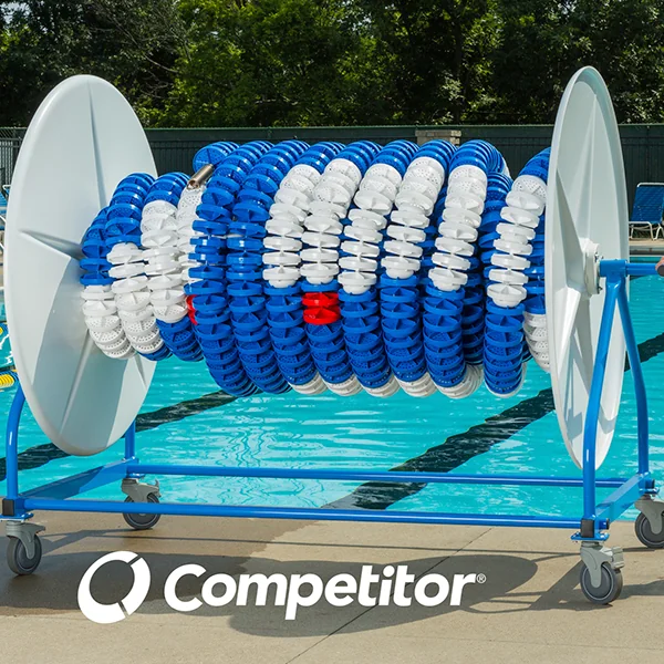 The Classic Stor-Lane Reel for swim racing lanes uses heavy duty molded end discs to keep the lanes on the core and features streamlined hardware and an easy access handle on the end frame for safe mobility.