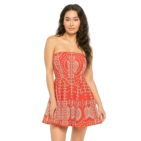 Clem mini dress is accented with broderie anglaise details and the neckline and hem are finished with scalloped trim. Offers smocking in the back for an easy pullover fit.