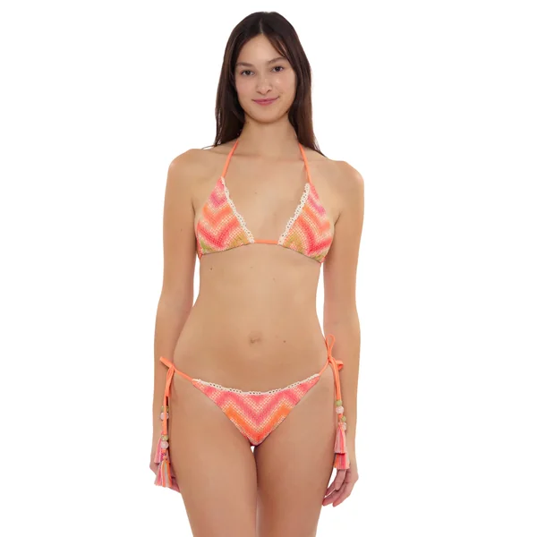 Triangle bikini top features a vibrant multicolor zigzag mesh overlay and lacey trim. Offers adjustable neck and back ties adorned with colorful beads and tassels.