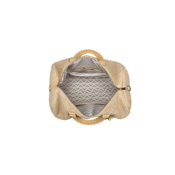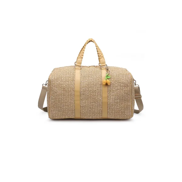 Weekender bag is designed with a spacious interior, perfect for getaways or stylish gym sessions. Crafted from durable vegan materials, it features braided handles adorned with a playful crocheted lemon charm. Offers an adjustable, detachable shoulder strap and zipper closure.
