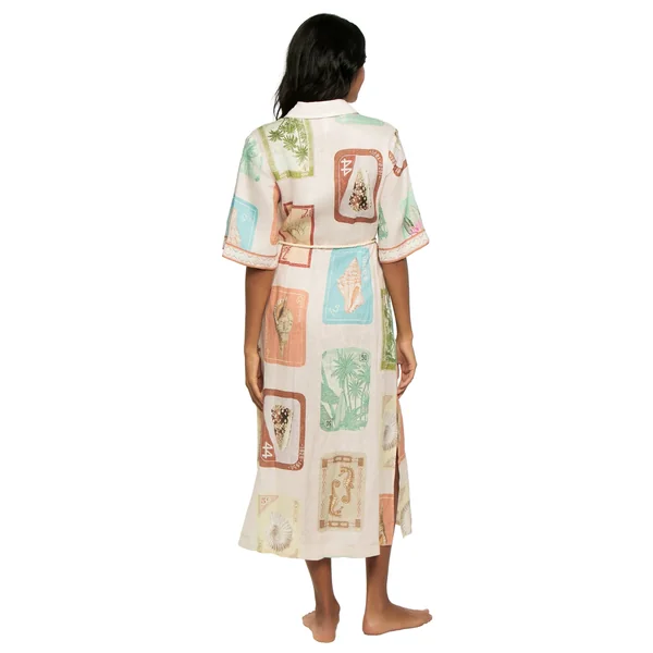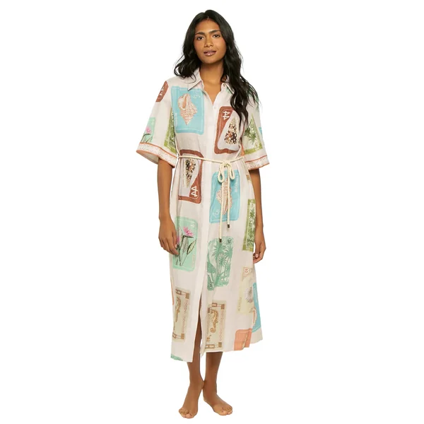 Linen blend midi dress features various stamp detailed tropical island themed prints, collared neckline, button front, short sleeves, and a removable waist tie.