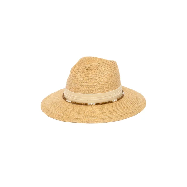 Coco paper braid fedora features a layered raw edge fabric band adorned with pearl and wood beaded details.