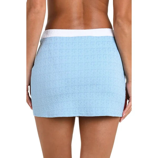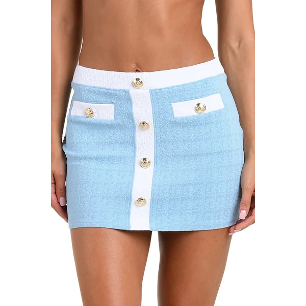 Coco skirt features a chic colorblock design, boucle swim textured fabric, and gold medallion button details.