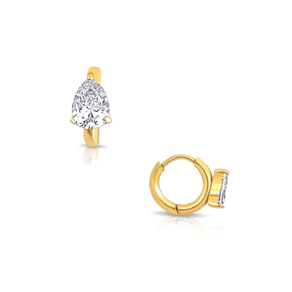 Colette hoop earrings are water-resistant, made from gold-plated stainless steel, and feature a pear-shaped cubic zirconia. Offers a snap back closure.