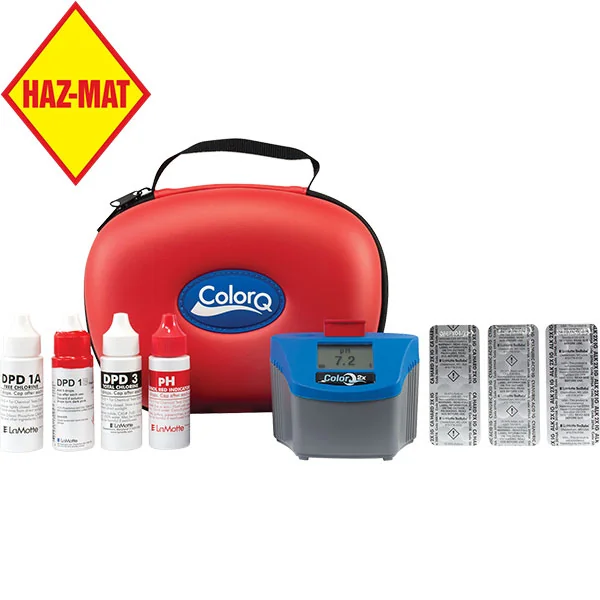 LaMotte’s ColorQ 2x Pro 7 Kit hand held pool water testing photometer directly measures seven parameters on a digital display using both liquid reagents and Testabs. The hand held photometer eliminates the need to visually determine slight color variations, thus taking the guesswork out of poolside water analysis.The ColorQ 2x Pro 7 Kit includes enough liquid reagents to measure 144 tests per test factor, as well as 100 tablets for each Testabs test. The photometer, testing reagents and photo-diagrammatic trilingual instructions (English, Spanish, French) are all packaged in a convenient carrying case for on-site testing.