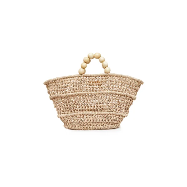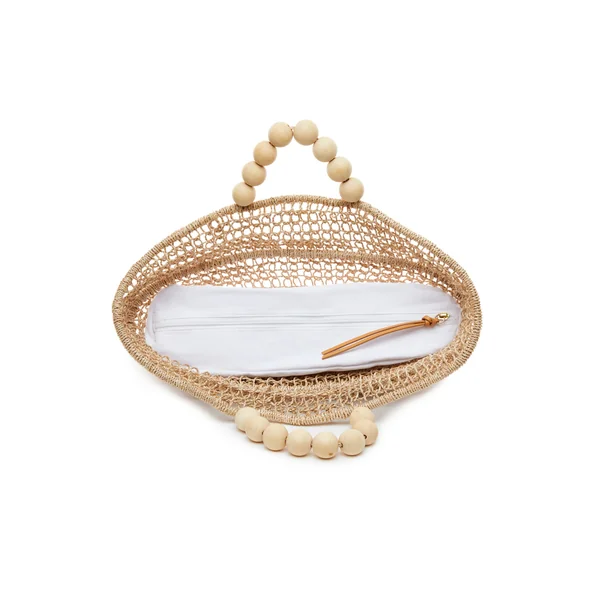 Tote bag features open weave straw and bead detailed straps. Offers a removable zip pouch..
