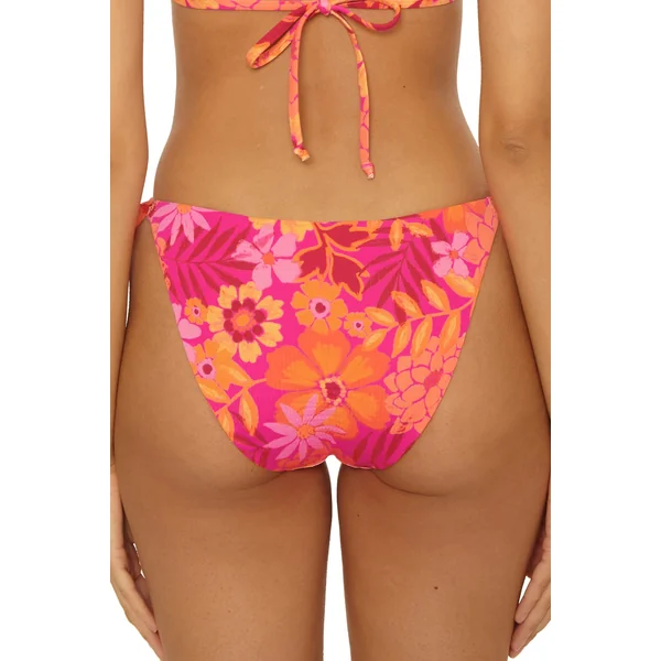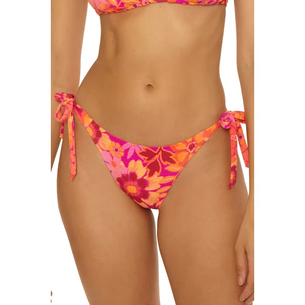 Bikini bottom features floral print and textured fabric that reverses to a smooth solid. Offers adjustable tie sides and moderate bottom coverage.