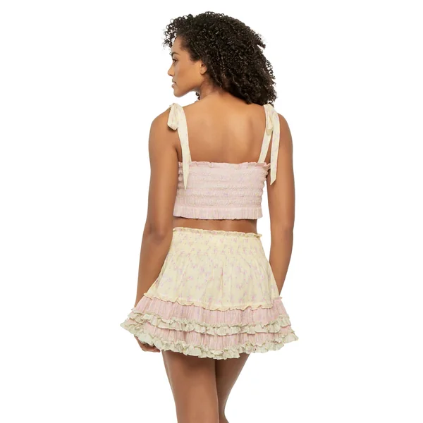 Corbin crop top features ditsy floral print, smocking, ruffle trim and offers adjustable tie straps.