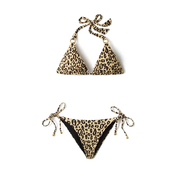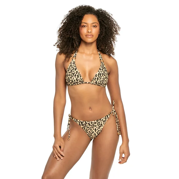 Corsica leopard print bikini top features gold rings on the straps, adjustable neck and back ties.