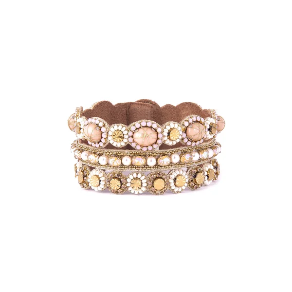 Coryn bracelet features layers of glass beads, metal and brass accents and offers magnetic closure.