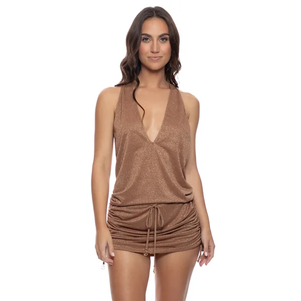 Mini dress features shimmer fabric, deep v neckline, ruched drawstring sides for adjustable length and a draped open back with knotted t-back strap.