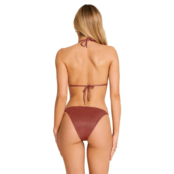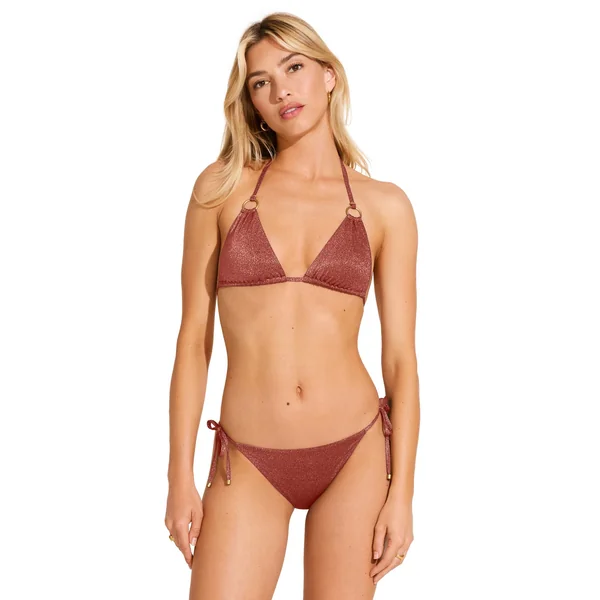 Cosmo triangle bikini top features metallic fabric and matte gold ring details. Offers removable cups and adjustable ties at the neck and back.
