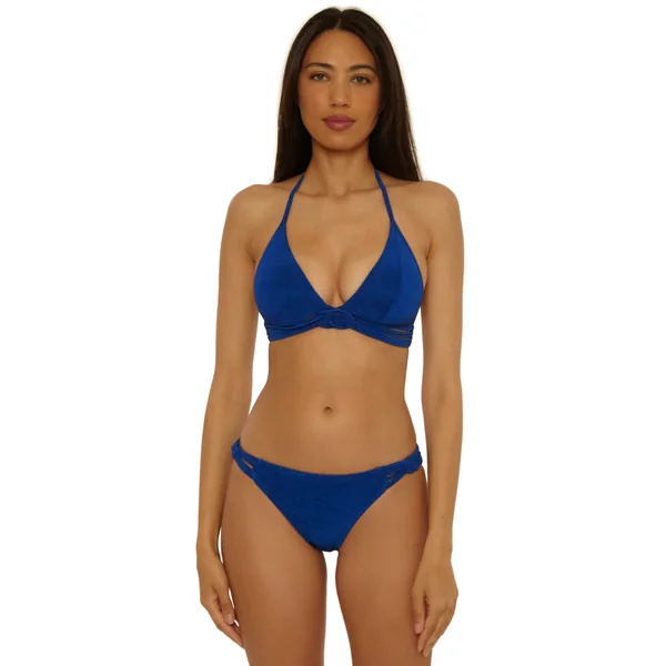 Textured bikini top features a knotted rope under-bust band. Offers removable soft cups, adjustable halter ties with gold-plated bead details, and a tie back closure.