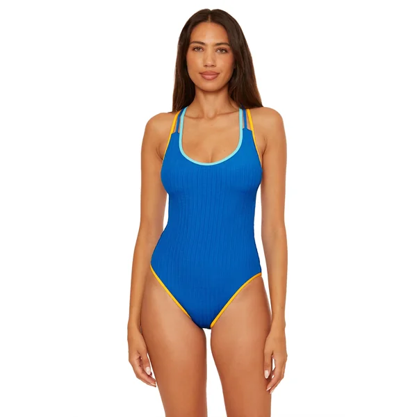 One piece swimsuit features contrast colorblock binding and crinkle pucker texture. Offers removable soft cups, a strappy racer-back with a square buckle detail, and moderate bottom coverage.