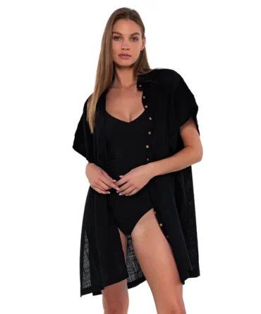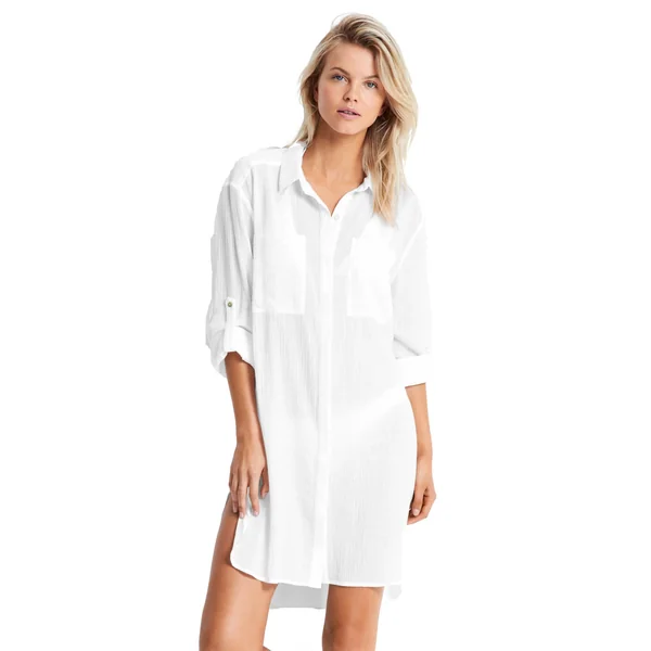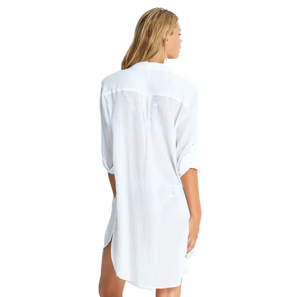 Crinkle Twill Beach Shirt dress features a collared neckline with a button down front, three-quarter cuff sleeves, front pockets and side slits.