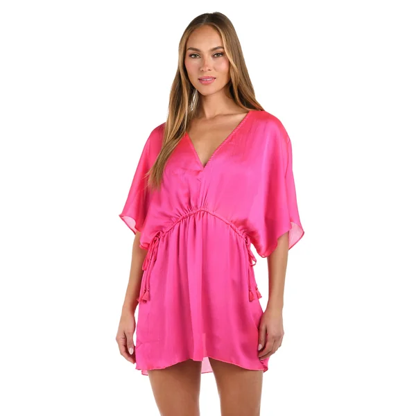 Tunic features lightweight crinkle fabric, v-neckline, mid length sleeves, and drawstring waist.