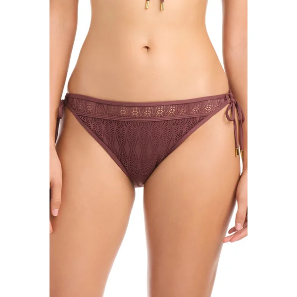 Bikini bottom features crochet overlay and offers adjustable tie sides.