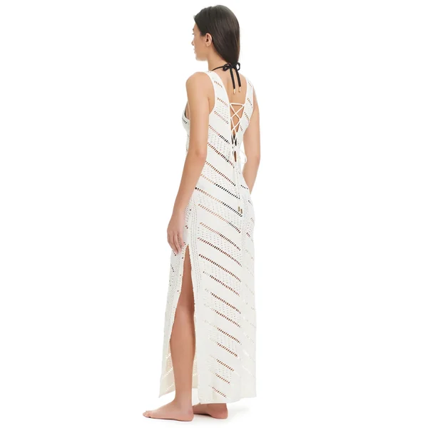 Maxi dress features diagonal crochet, lace-up details, and a side slit. Additionally, it is reversible, providing versatility in styling.