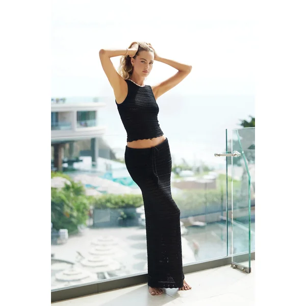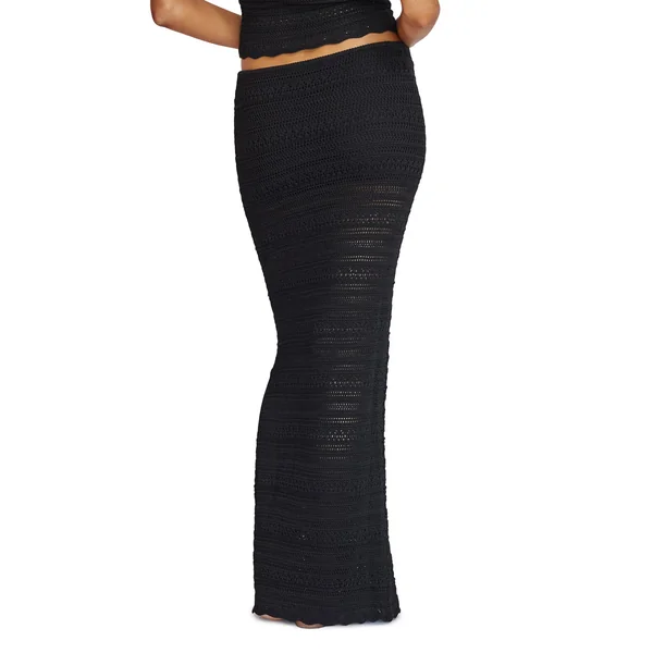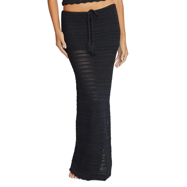 Maxi skirt features open-knit crochet, scalloped hem, and drawstring waist tie with tassels.