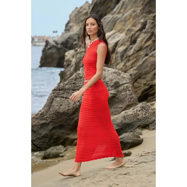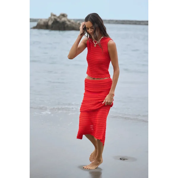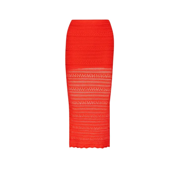 Figure hugging midi skirt features open weave crochet with a partial lining, scalloped hem and a back slit.