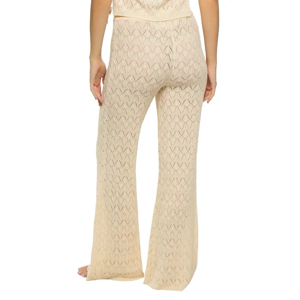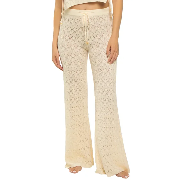 Pants feature chevron patterned crochet and adjustable drawstring ties with shell details.